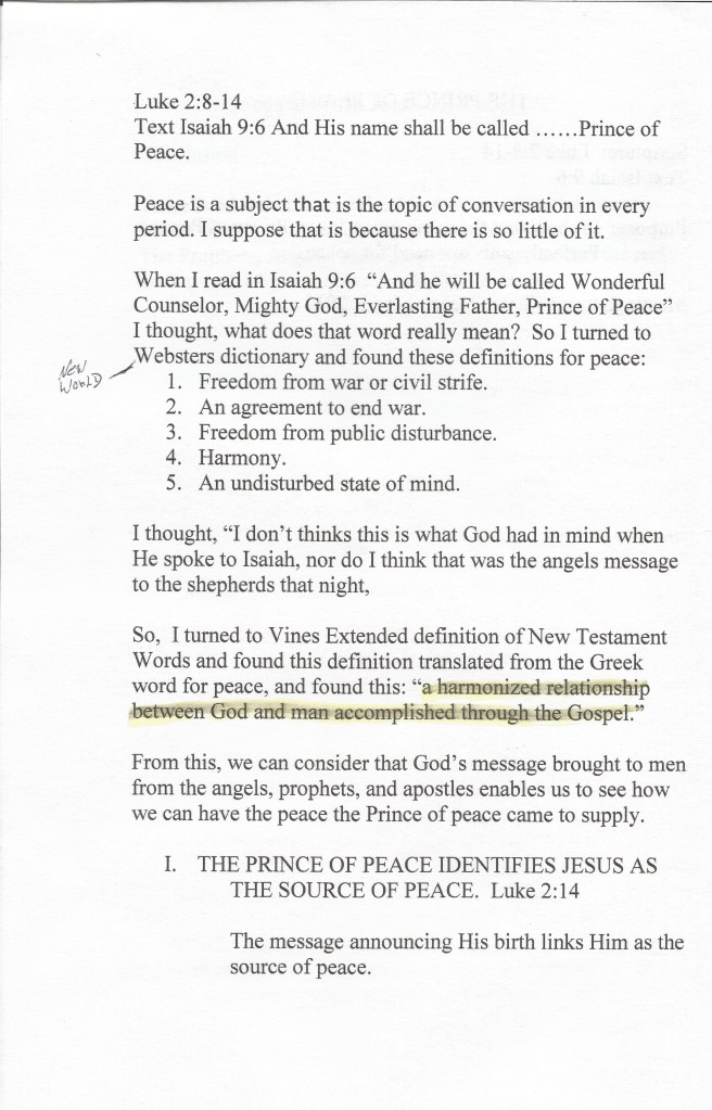 December 31, 2020December 30, 2020 by melindasbaker The Prince of Peace Luke 2:8-14 Isaiah 9:6 To show that the name given Jesus, Prince of Peace, perfectly suits our need for peace. Share this: Share on X (Opens in new window) X Share on Facebook (Opens in new window) Facebook Like Loading... Related