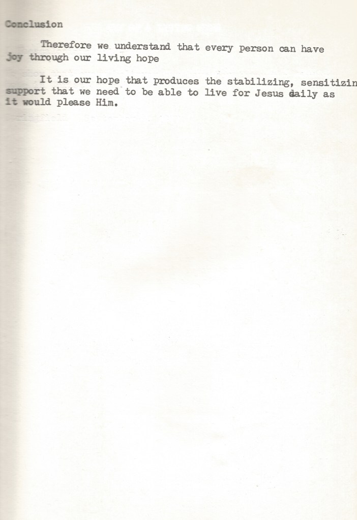 February 5, 2021February 4, 2021 by melindasbaker The Joy of a Living Hope I Thessalonians 5:12-22 To show that every believer can have joy through a living hope in Christ Jesus. Share this: Click to share on X (Opens in new window) X Click to share on Facebook (Opens in new window) Facebook Like Loading... Related